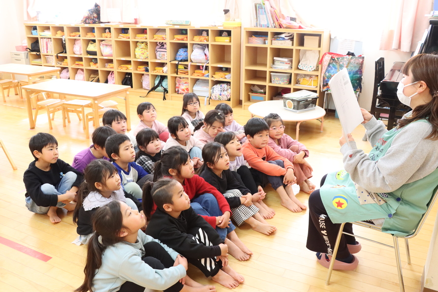 まずは「ふくおかくだもの フルーツパワーズ」の紙芝居をみんなで楽しみました。私たちの住む福岡県ではたくさんの果物が作られていることや、雨が降りすぎても美味しい果物は育たないことなど、子どもたちは紙芝居を通して知ることができたようです。