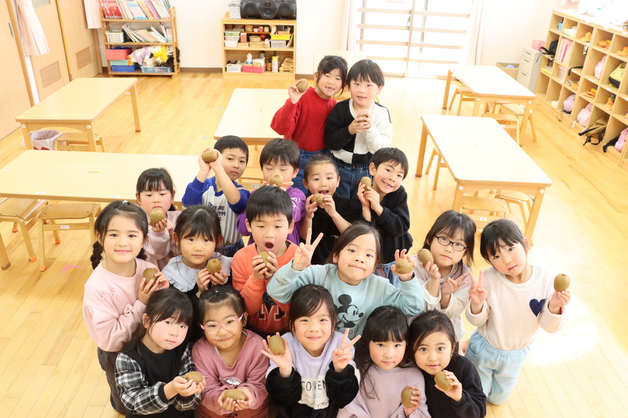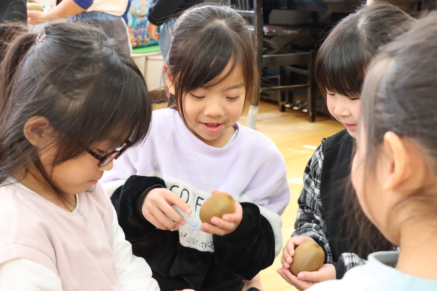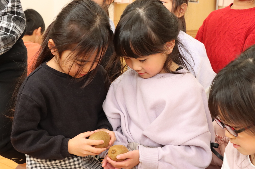 お話の後は、お待ちかねのプレゼントタイム!一人ずつキウイを受け取ると、そのふわふわした産毛の感触に驚いたり、顔を近づけて匂いを嗅いでみたり。「おいしそうだね」「大事に持って帰る!」と、小さな手でそっと優しく抱える姿がとても印象的でした。