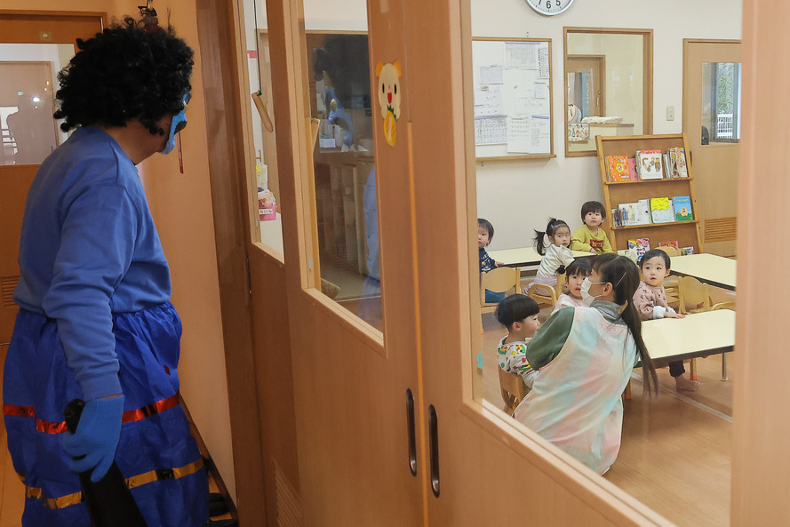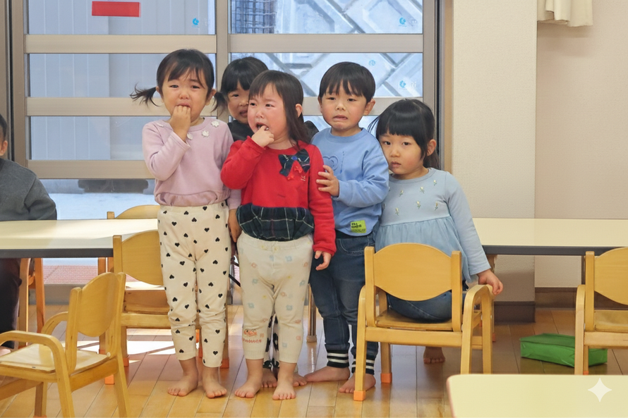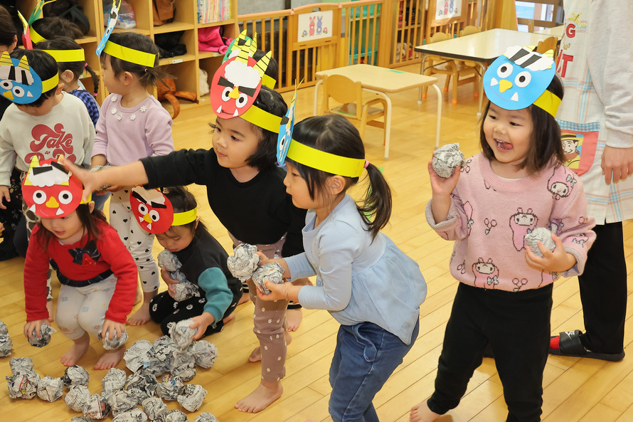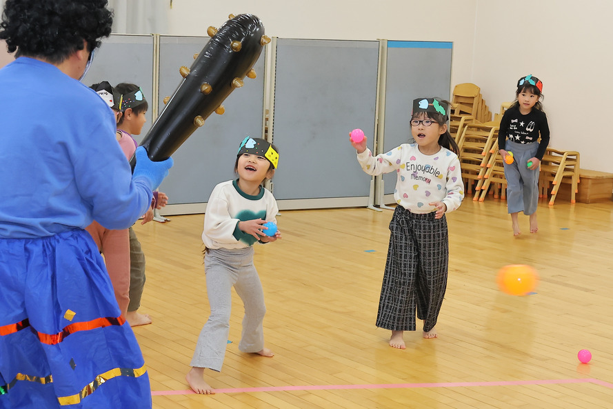 未満児クラスの小さい子たちは、鬼の姿が見えただけで大泣き。先生の後ろに隠れて必死に逃げようとする姿が、なんとも微笑ましい光景でした。一方で以上児クラスの子たちは、怖さをこらえて「鬼は外!福は内!」と力いっぱい豆(ボール)を投げ、見事に鬼を退治してくれました。
