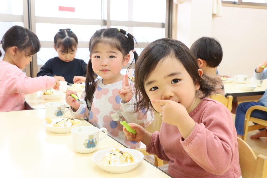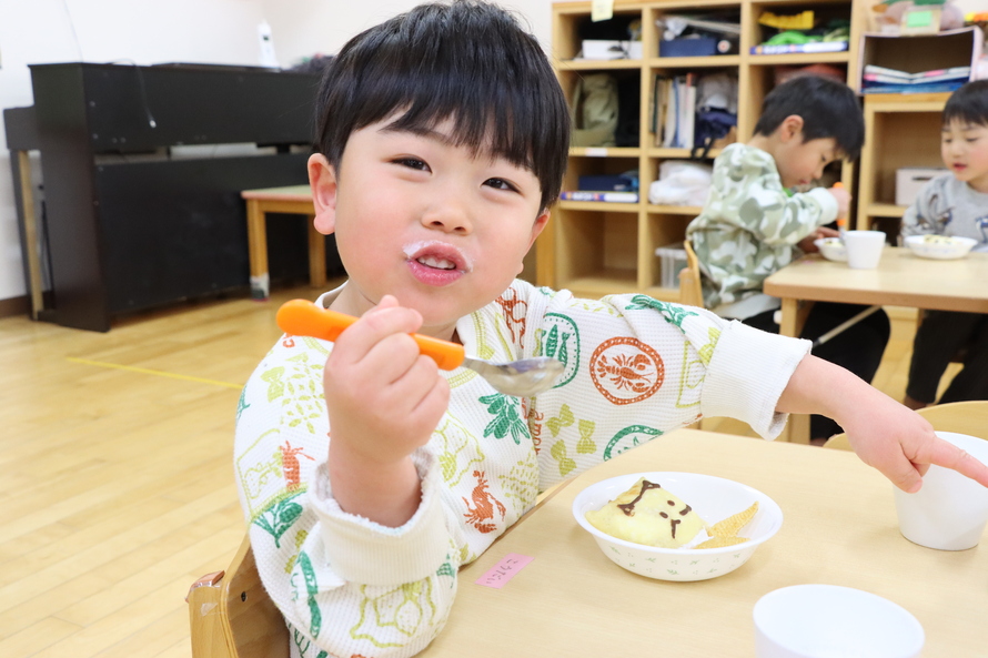 3時のおやつは「鬼さんクレープ」。こちらの鬼さんはみんなに大人気(笑)。可愛らしいおやつを前に、子どもたちはニコニコ笑顔で完食していました。心もお腹も満たされて、きっと素敵な春を迎えられることでしょう。